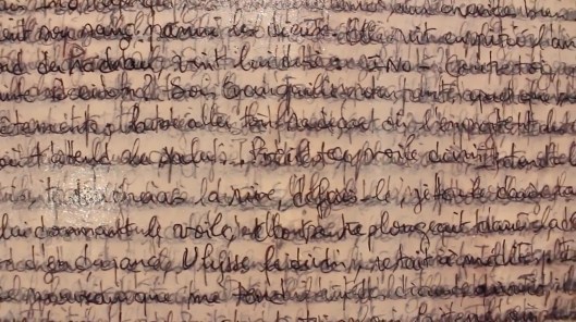 Je transcris l’Odyssée à mon tour, humblement, sur une feuille de papier coton haut de gamme à grain fin. Chaque phrase lue est manuscrite, matérialisée par les lettres liées dont certaines s’élèvent et d’autres sombrent. Chaque fois que la page est couverte d’une marée de lignes, une brume blanche recouvre la page jusqu’à la prochaine marée. Ces flux d’écritures se superposent et disparaissent. Chaque lettre flotte un temps puis sombre, invisible plancton du souvenir. Ainsi le récit des aventures incroyables du sage Ulysse, le demi-dieu aux mille tours, est-il tout entier dans une page ; présence indicible, le récit est là, illisible.